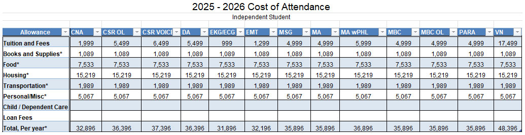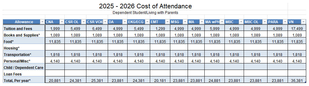 For additional fees, please click on the Student Training Estimate for your program of choice: