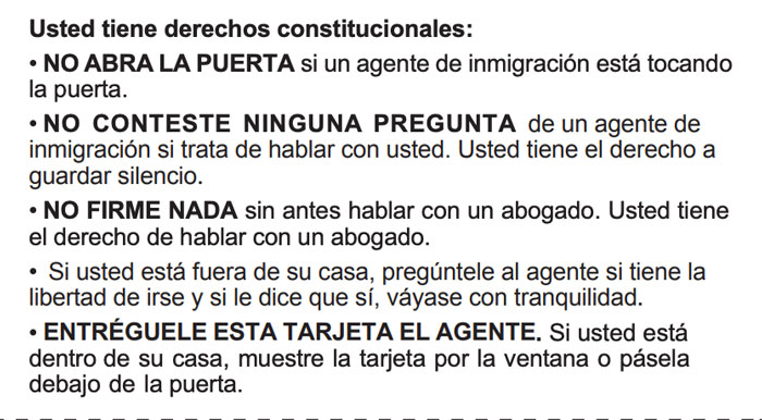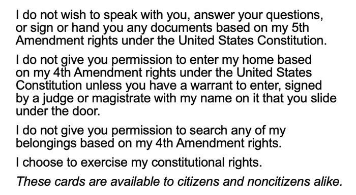 - All people, regardless of immigration status, have rights under the U.S. Constitution. The Immigrant Legal Resource Center’s (ILRC) Red Cards help people assert their rights and defend themselves in many situations, such as when I.C.E. agents go to a home.
